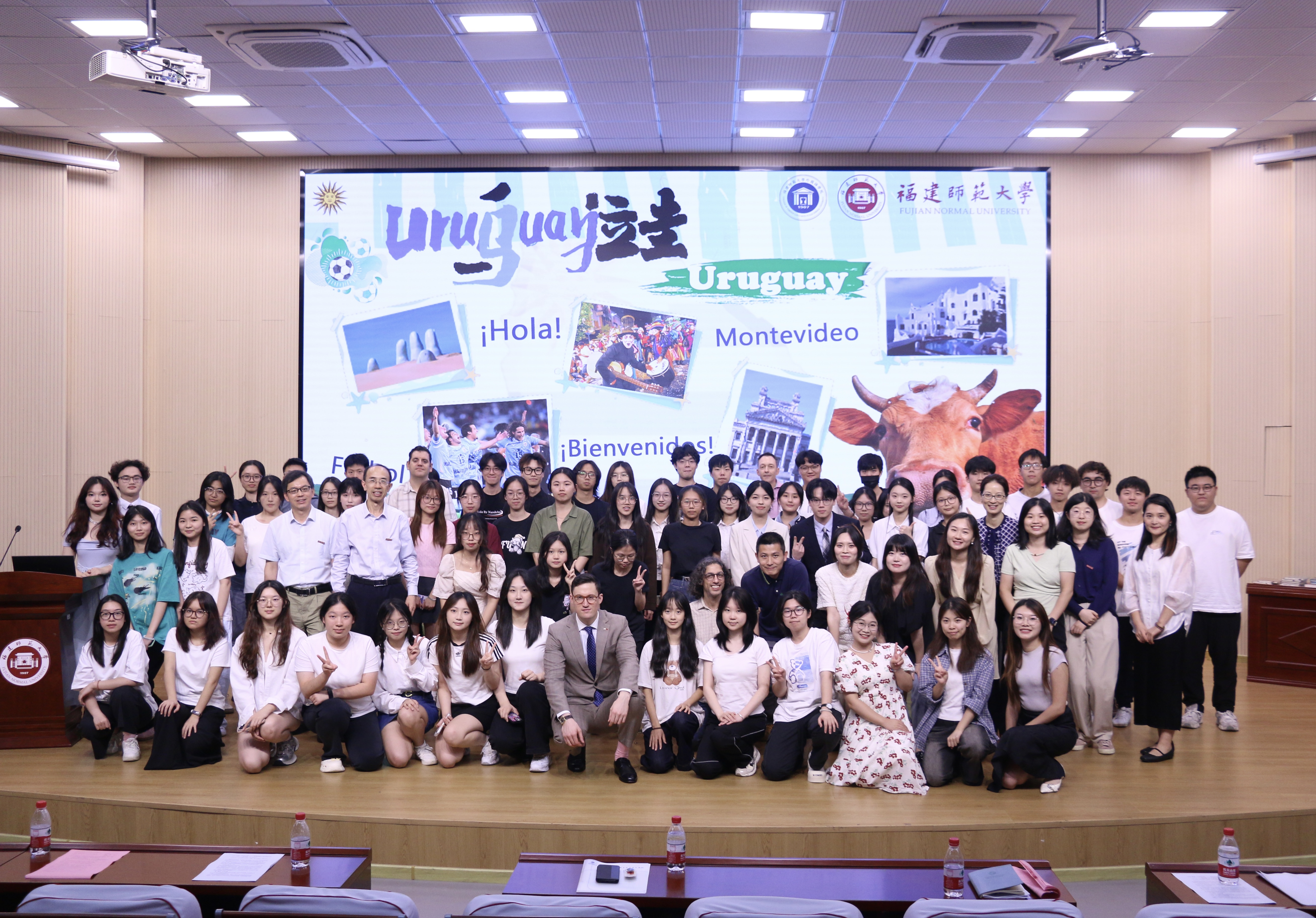 期间,法昆多·费尔南德斯一行参观了乌拉圭女性诗人作品展及学生文化简报比赛优秀作品展,观看了我校学生表演的中西双语歌曲、文学舞台剧,参与了知识互动游戏,并欣赏了师生原创主题视频。法昆多·费尔南德斯围绕“乌拉圭文化全景-足球、音乐、文学对话世界”主题发表了精彩演讲。在活动中,同期举行了文化简报比赛颁奖仪式,对学生的实践成果给予表彰。