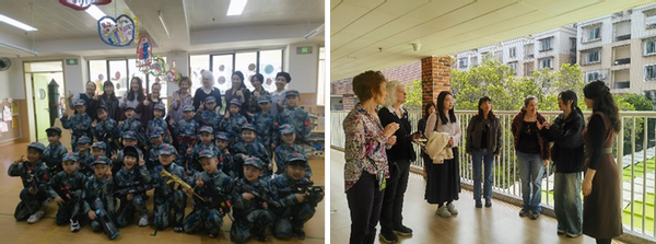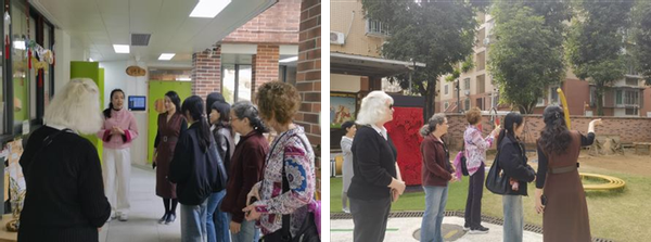 在园方与教育学院教师的引导下,匹兹堡州立大学教师代表团一行实地走访了教学活动室、特色活动区、户外游戏场地等场所,了解了幼儿园特色的儿童哲学课程,并深入班级与幼儿友好互动,沉浸式感受园所“行是知之始,知是行之成”的办园理念。
